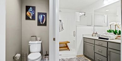Luxury decor with large TV, performance sleeper sofa, leather recliner, dining table with kitchen bar. Recliner Added after this photo.